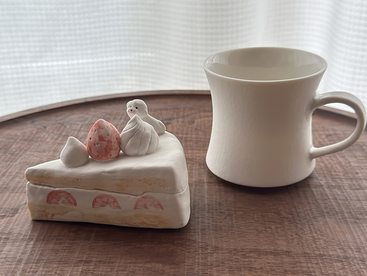 期間中お問い合わせいただくことも多かったのはDMにも掲載した作品、陽子さんのショートケーキの蓋物作品です。蓋を閉じていても可愛いのですが、開けるとサプライズもある(小指の爪くらいのサイズの女の子がショートケーキを持っている)何とも可愛らしい作品です。