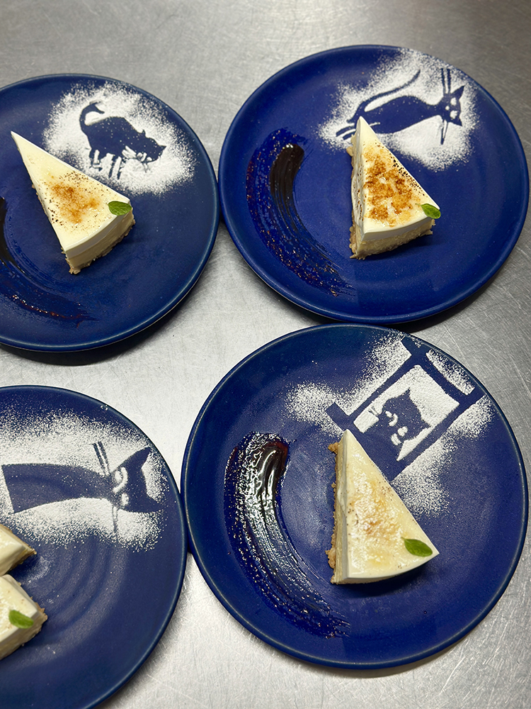 会期中は、柳本さんの描く猫「マズー」と「小石」を写した粉糖デコレーションでケーキセットもお楽しみいただきました。