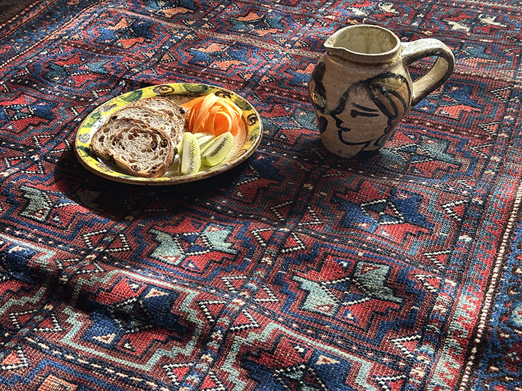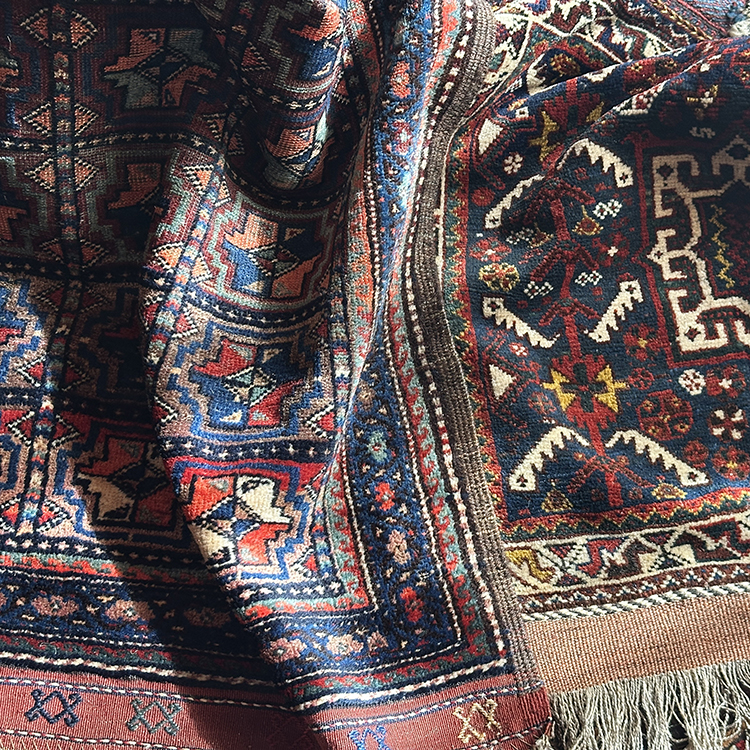 トライバルラグは古くて状態の良いものほど価値が高く、80年以上前の実際の遊牧生活のなかで紡がれ織られたラグは、例えば約30年前に織られたというものと比べると羊毛の質が全然違うそうです。